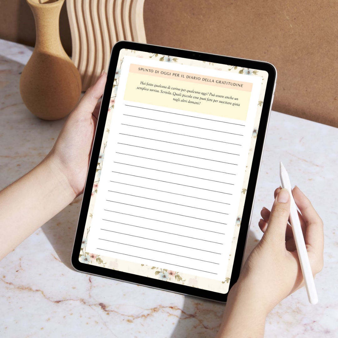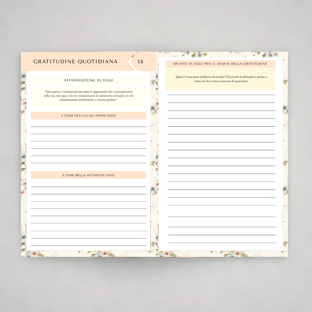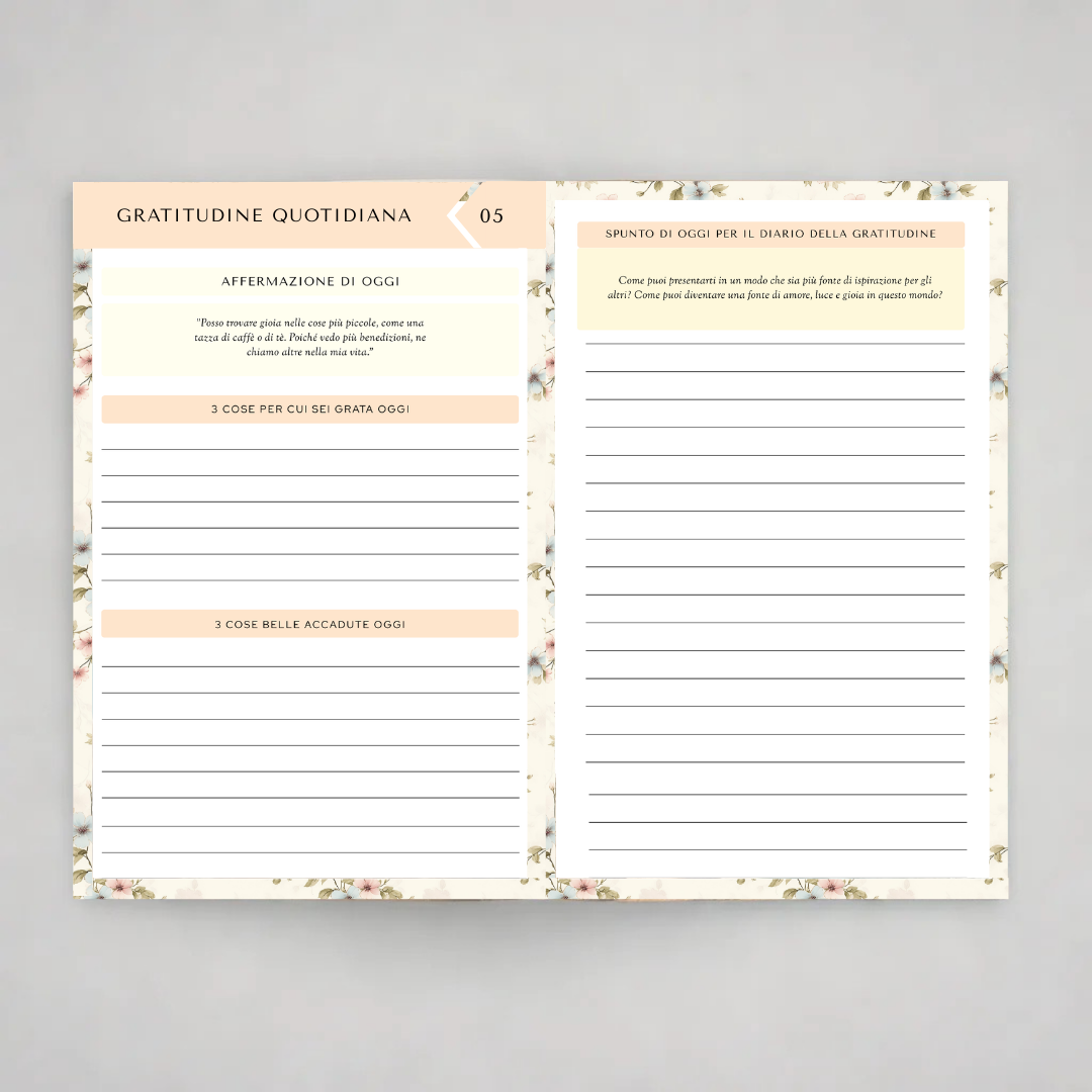 Bastano pochi minuti ogni giorno per annotare pensieri, riflessioni e piccoli momenti di gratitudine. Il diario ti aiuta a focalizzarti su ciò che conta davvero, migliorando il tuo benessere e la tua felicità quotidiana
